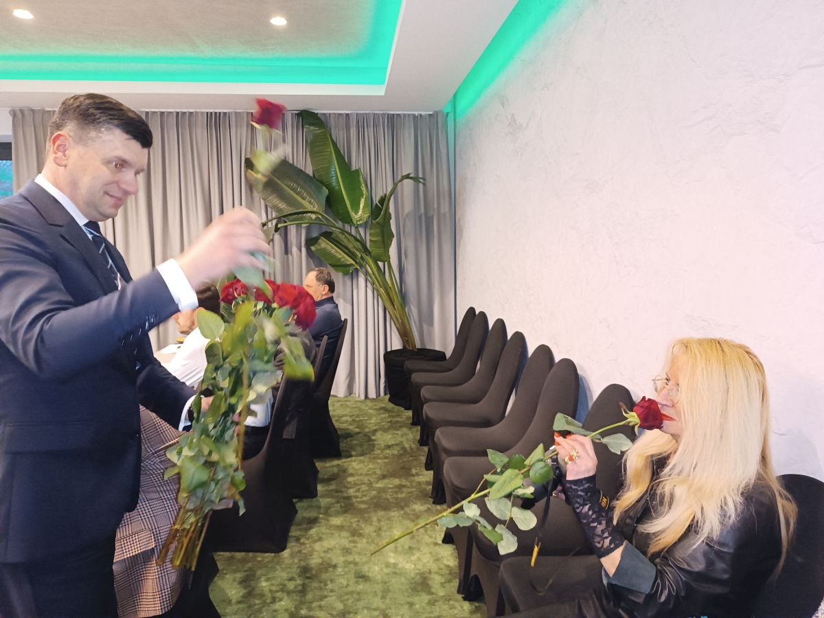 Smółką wręczał paniom biorącym udział w forum, róże z okazji zbliżającego się Dnia Kobiet.